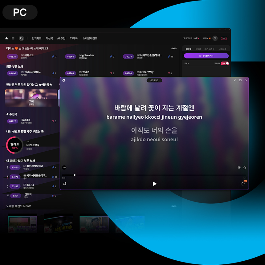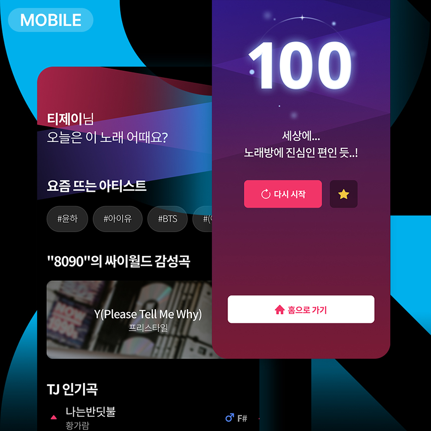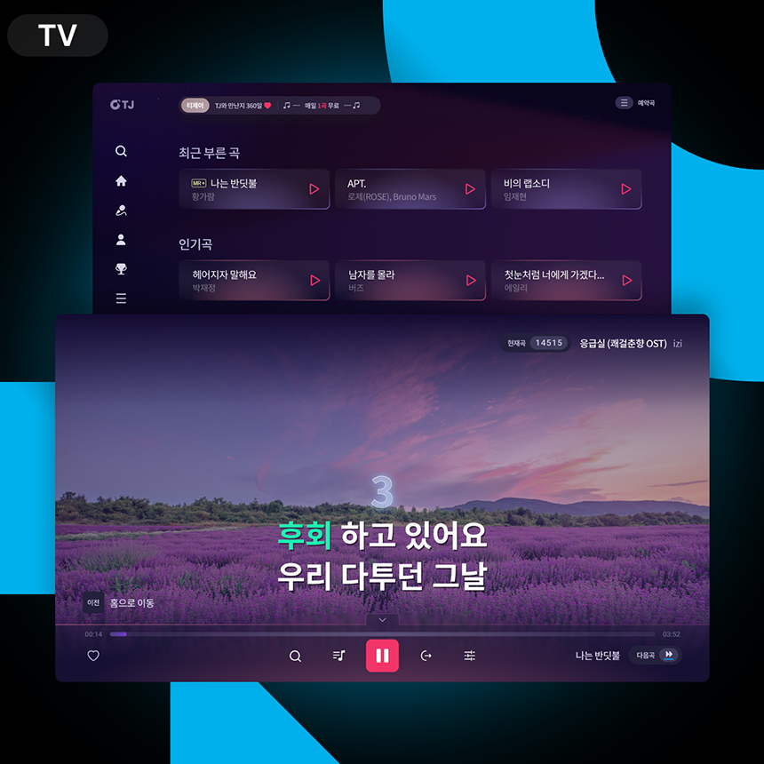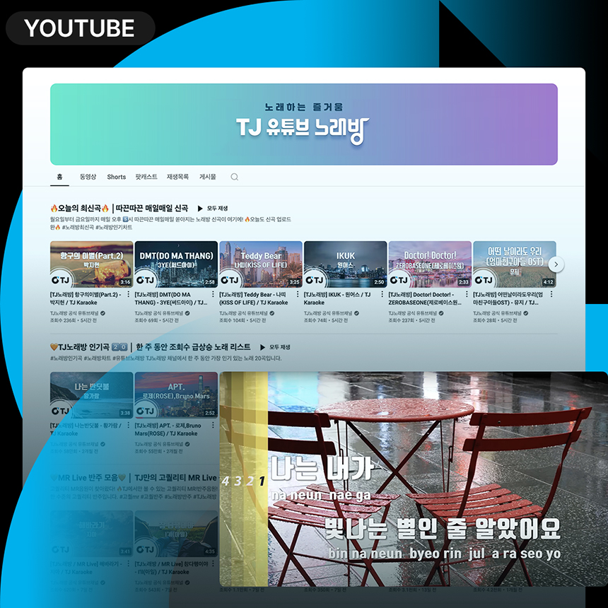 언제 어디서나 노래방 콘텐츠를 즐길 수 있도록 온라인, 모바일, TV, 유튜브를 통해 고음질 노래방 음원 서비스를 제공합니다